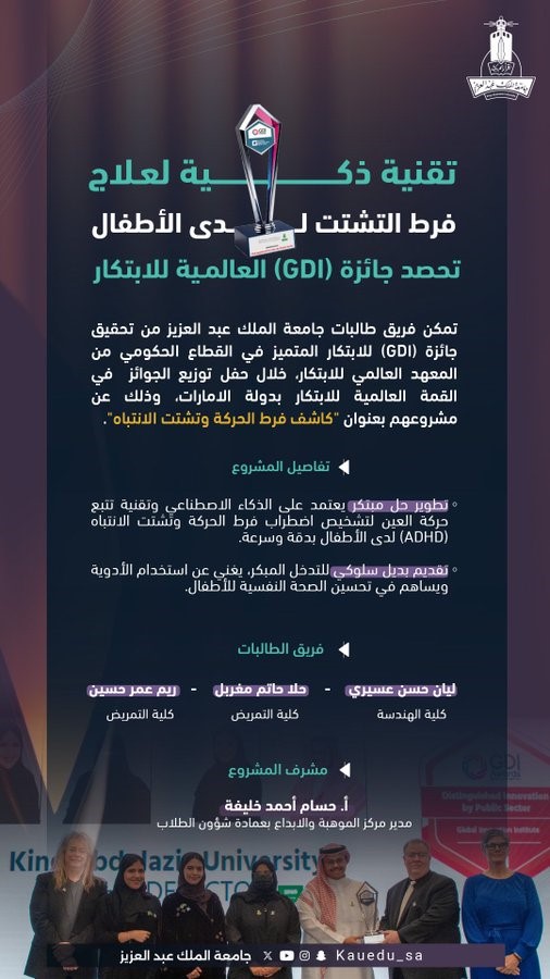 A team of female students from King Abdulaziz University has won the prestigious GDI Global Award for Innovation in the Public Sector at the Global Innovation Institute in the United Arab Emirates, for their innovative project titled "ADHD Detection".